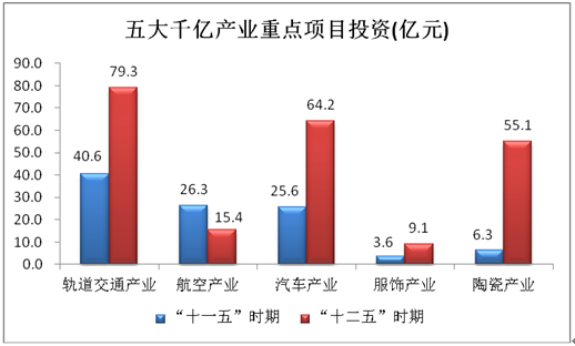 1、促进支柱产业快速发展。“十二五”全市在重点项目的安排上体现战略性、代表性和示范引导性,加大支柱产业投入。五大千亿产业重点项目累计完成投资223亿元,比“十一五”时期增加120.6亿元,增长1.2倍,占全部重点项目投资的11.9%,占工业类重点项目投资的45.9%。北汽集团株洲基地一期、南车株机不锈钢城轨车辆项目、南车时代电气IGBT项目、醴陵旗滨玻璃、中航航空发动机维修中心、旭日陶瓷、海纳川株洲零部件基地等一大批具有自主知识产权和核心关键技术的项目建成投产,达到了国内一流水平,有的还达到国际先进水平。这些重点产业项目竣工投产,为产业加速发展增添了后劲,促进了全市经济快速发展。轨道交通、汽车、航空、服饰、陶瓷等产业集群不断发展壮大。2014年全市轨道交通装备、汽车、陶瓷、航空、服饰五大千亿产业共完成工业增加值375.6亿元,比2010年增加199.7亿元,四年累计增长113.5%。