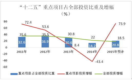 1、纵向比较,拉动作用降低。“十二五”期间,全市重点项目投资增速大幅波动。2011、2012年重点项目投资分别增长72.4%和53.6%;2013年增幅放缓,增长8.4%,低于当年全部投资22.4个百分点;2014年大幅下降43.4%,预计2015年增长73.9%。五年平均增长22%,低于同期全部投资增幅6.3个百分点。重点项目投资占全部投资比重走低。2015年,重点项目投资占全部投资的比重为20.8%,比2011年降低11.8个百分点。重点项目投资增幅相对较低,比重下降,对全市投资增长贡献减弱,拉动不力。