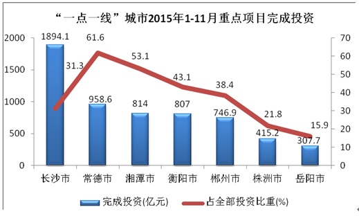 2、横向对比,差距明显。在全省“一点一线”七个城市中,无论是项目个数、投资规模,还是占全部投资的比重,株洲重点项目建设差距较大。从项目个数看,2015年株洲安排重点项目184个,仅比岳阳多;从投资总量看,2015年1-11月株洲415.2亿元,仅大于岳阳;从占全部投资比重看,2015年1-11月株洲为21.8%,仅高于岳阳。