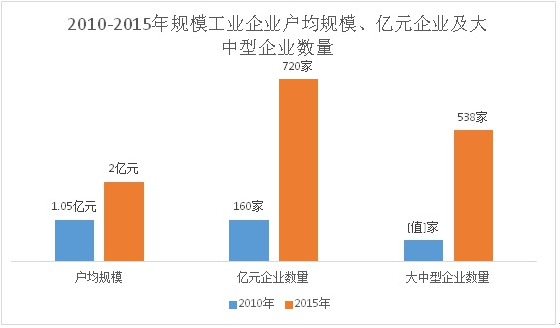 2、企业规模不断扩大。首先,从企业户均规模看,2014年,全市1451家规模工业企业实现主营业务收入2759亿元,户均规模为1.9亿元,是2010年企业户均规模的1.8倍,预计到“十二五”末,规模工业企业户均规模接近2亿元,达到“十二五”初的两倍。其次,从亿元企业数量看,成倍增长。2010年全市亿元工业企业只有160家,到2014年亿元企业达到了695家,是2010年的4.3倍,预计到“十二五”末,亿元企业数量将达到720家。最后,从企业类型看,2015年大中型企业538家,是2010年的6.6倍,其中:大型企业25家,比2010年增加14家,中型企业513家,比2010年增加440家。
