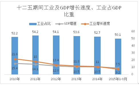 3、工业依然是经济发展的主动力。“十二五”期间,株洲工业受国内外经济环境的影响及自身转型升级的要求,发展速度明显低于“十一五”,但高于同期GDP增速。“十二五”期间工业年均增长速度为12.4%,高于GDP年均增速1.2个百分点。其中,2010-2014年,株洲工业增速高于GDP增速0.5-6.2个百分点。工业的比重超过五成,高于其他产业。2010年-2014年,株洲工业占GDP的比重分别为52.2%、54.2%、54.1%、53.6%和52.7%,到今年1-9月,工业占比仍然超过了50%,远高于其他产业。工业增长贡献突出。2010-2014年,株洲工业对GDP增长的贡献率分别为61.2%、65.5%、57%、59.2%和56.6%。今年1-9月,工业对GDP增长的贡献率为43.7%。