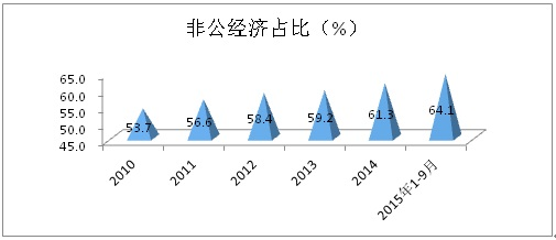1、非公经济成为主体。2010年-2014年,全市非公经济增加值占规模工业的比重分别为53.7%、56.6%、58.4%、59.2%、61.3%,今年1-9月,占比达到了64.1%,比2010年提高10.4个百分点,超过“十二五”规划目标要求4.1个百分点。