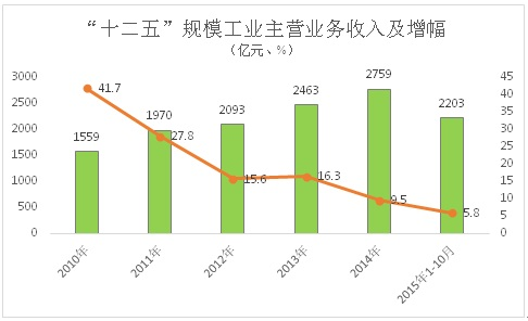 1、主营业务收入增长较快。2014年,全市规模以上工业企业实现主营业务收入2759亿元,是2010年的1.8倍,年均增长17.3%。今年1-10月,全市规模以上工业企业实现主营业务收入2203亿元,增长5.8%。