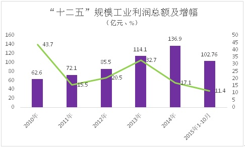 2、利润总额成倍增长。2014年,全市规模工业实现利润总额136.9亿元,增长17.1%,利润总额是2010年的2.2倍,年均增长21.6%。今年1-10月,规模工业企业实现利润总额亿元,增长11.4%,高于规模工业增速3.5个百分点。