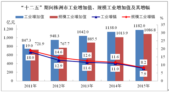 全市工业增加值1182亿元,比上年增长7.9%,其中,规模工业实现增加值1086.8亿元,增长8.2%。规模工业企业实现利润144.8亿元,增长6.6%;规模工业企业实现利税317.8亿元,增长13.5%;规模工业新产品产值610.4亿元,增长18.9%。战略性新兴产业增加值397.4亿元,增长11.4%,园区规模工业增加值742.7亿元,增长9.5%。