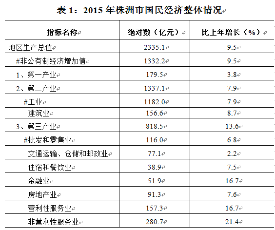 全市三次产业结构由2014年的7.7:59.3:33调整为7.6:57.3:35.1,与上年比,第一产业和第二产业比重分别降低0.1个和2个百分点,第三产业比重提高2.1个百分点。第一、二、三产业对GDP的贡献率分别为2.8%、50.8%和46.4%。