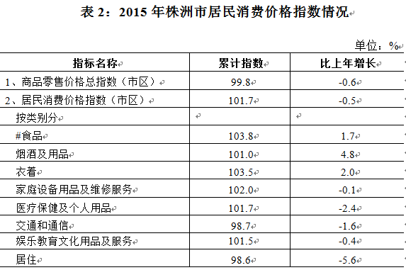 全市居民消费价格累计指数为101.7%,比上年下降0.5个百分点。其中,居住价格下降5.6个百分点,医疗保健和个人用品价格下降2.4个百分点,交通和通信价格下降1.6个百分点;烟酒及用品价格上涨4.8个百分点,衣着价格上涨2个百分点,食品价格上涨1.7个百分点。全市商品零售价格累计指数为99.8%,比上年下降0.6个百分点。