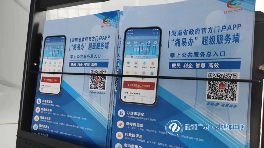 体验区内配备了音响设施,循环播放“湘易办”APP推介宣传片,张贴海报、摆放操作指南,立体展示“湘易办”超级服务端的强大功能,并安排专人引导注册、使用和讲解,以确保推广体验效果。