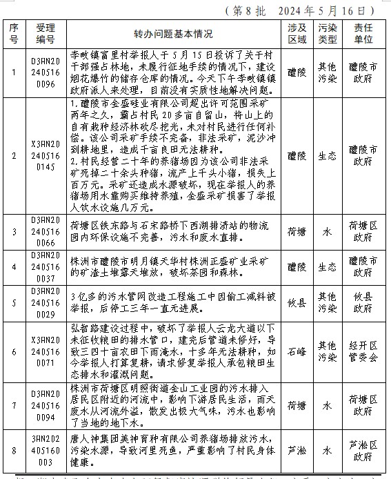 5月17日督察组交办第八批信访件134件,其中我市8件。督察组累计交办737件(分解后743件),株洲28(+1)件,在全省各市州中信访件数量排名第10。我市按区域分布为:醴陵11件,攸县4件,天元、芦淞、荷塘各3件,茶陵2件,石峰、渌口、经开区各1件,炎陵0件。