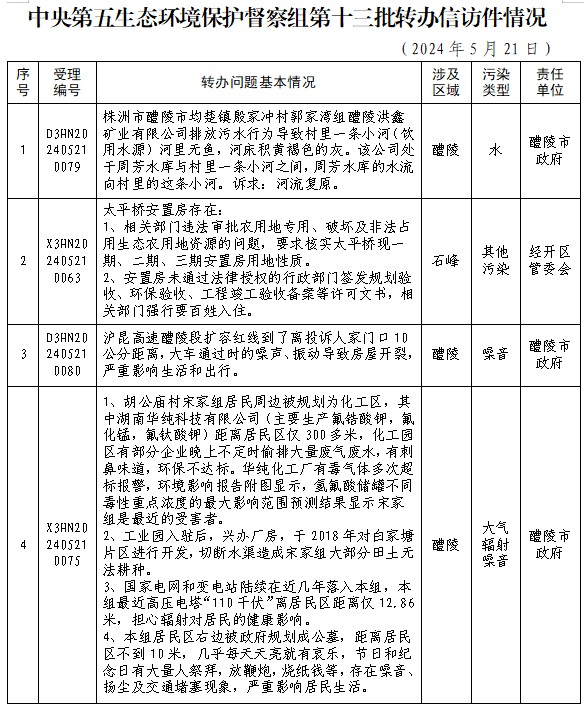 5月22日督察组交办第十三批信访件123件,其中我市9件。督察组累计交办1308件(分解后1314件),株洲66(+1)件,在全省各市州中信访件数量排名第8。我市按区域分布为:醴陵19件,攸县12件,天元8(+1)件,芦淞、石峰各6件,荷塘5件,茶陵4件,渌口、经开区各3件,炎陵0件。