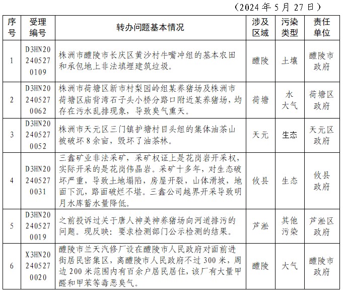 5月21日接到中央环保督察组转办信访举报件“渌口南洲垃圾倾倒污染问题”后,渌口区委副书记、区长赖晓智亲自督导该问题整改情况,责成由区城管局牵头联合相关部门尽快完成整改。有关部门立即行动,对南洲镇湘东村社塘组建筑垃圾开始前期平整运输道路工作,现场垃圾清理筛选运送至华新水泥公司进行协同窑焚烧处置,对裸露地块进行抑尘复绿。截止5月27日该件已办结,现场倾倒填埋的建筑、生活垃圾已完成清运;对裸露地块进行了防尘网覆盖并播洒草籽复绿;现场已树立“严禁倾倒垃圾”的警示标志,进出道路口设置了路障。